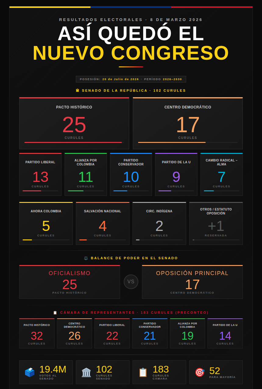 Colombia estrenó el 8 de marzo de 2026 un nuevo Congreso que tomará posesión el 20 de julio y que marcará el terreno político en el que gobernará el próximo presidente. El resultado es una cámara profundamente fragmentada, donde ningún partido tiene mayoría absoluta y las alianzas serán la moneda de cambio permanente.